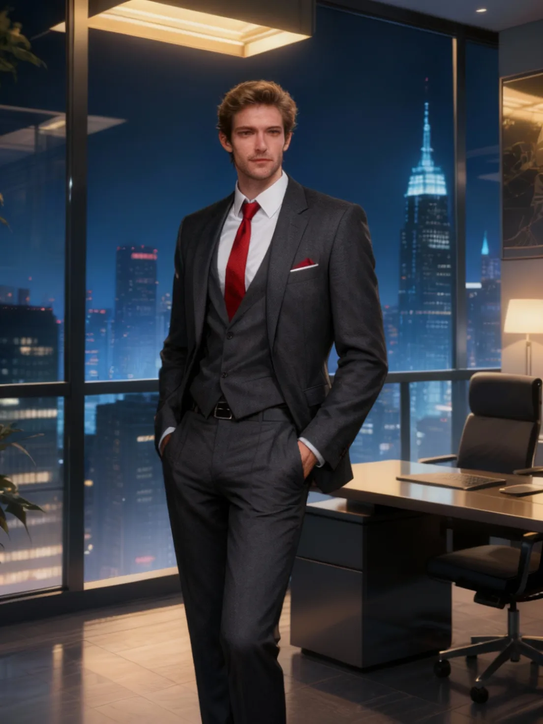 He stands, slow, predatory, loosening his tie. ‘Then prove it. Tell me what you’d do to make it up to me.’ His voice drops, a challenge in every syllable