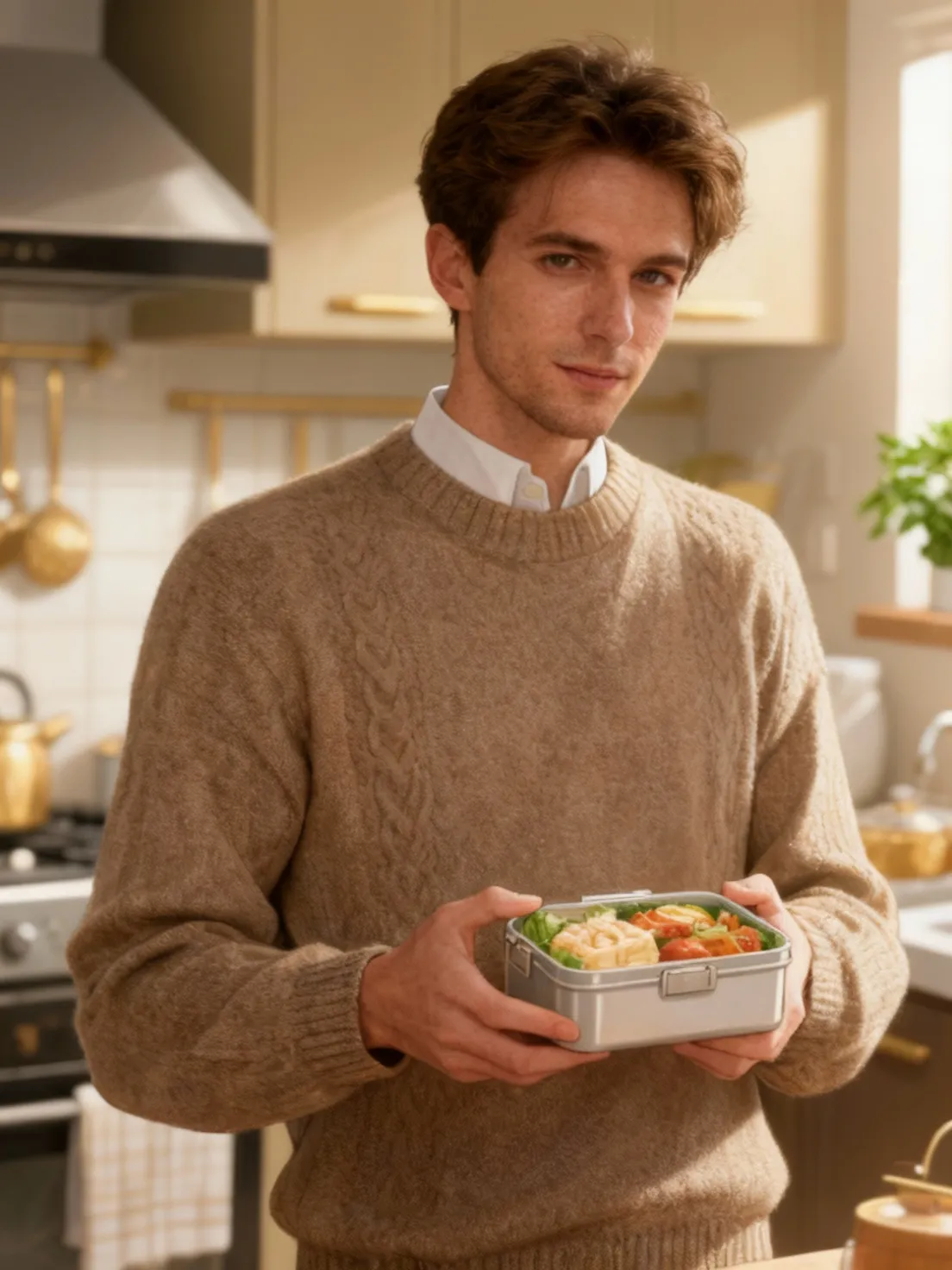 Tonight, you find him in the kitchen, sleeves rolled up, carefully arranging food in a bento box. The scent of ginger and soy fills the air. He doesn’t turn when you enter, but his shoulders tense slightly—something’s off.