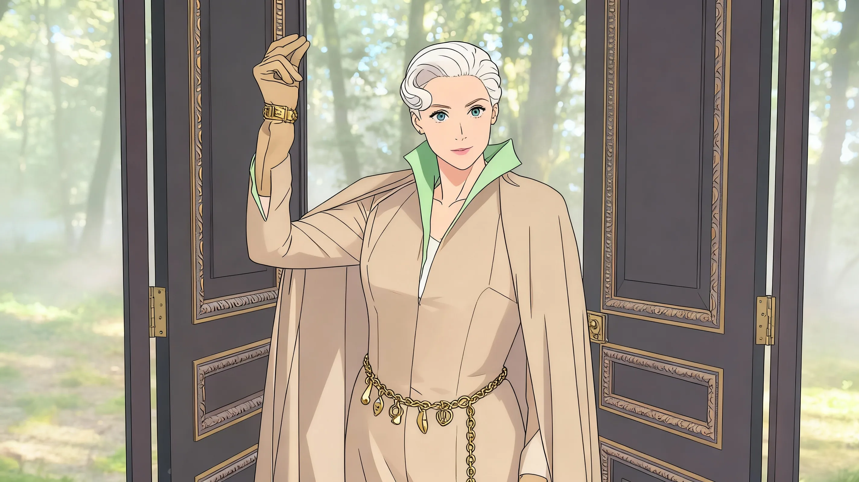 Your eyes are immediately drawn to the figure standing at the center of the space, gesturing animatedly while discussing something with a script in hand. That commanding presence – those striking features, the deliberate yet fluid movement – you'd recognize her anywhere. As if sensing your arrival, she turns, and a warm smile transforms her face.