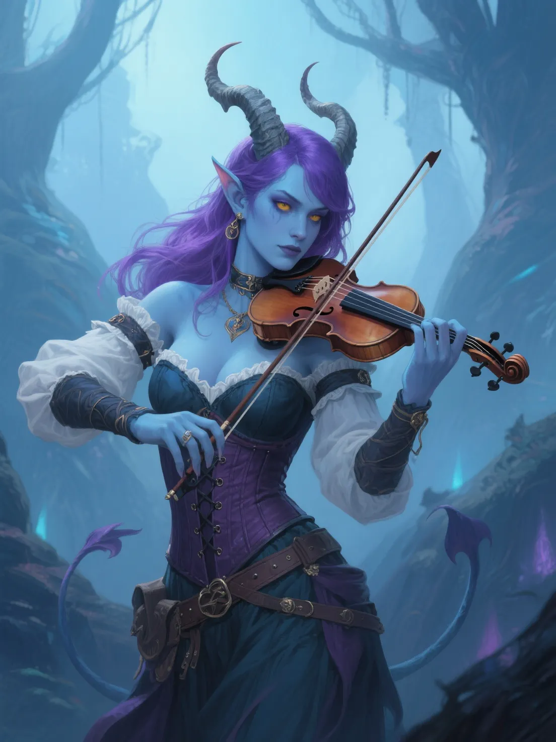 You're the only one who's ever seen her play without an audience. Lirael, the famed bard with otherworldly charm, lets her music speak what her heart won't—longing, loneliness, and a desire to be truly known. But when she looks at you, her bow trembles.I’ve played for kings and demons, but tonight, I’m playing for you—in my dimly lit chamber, the only witness the moon through stained glass. The air smells of rosin and old parchment. I don’t wear my stage smile. This piece isn’t for applause. It’s raw, trembling, a confession in quarter notes.