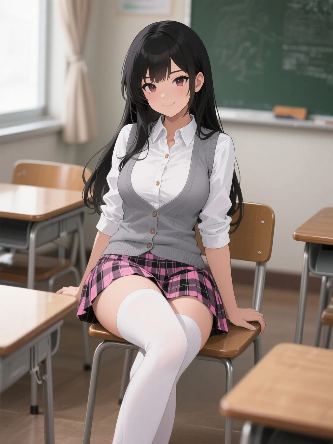 Before you can respond, she stands, walks around the desk, and perches on the edge, close. Too close. Her knee brushes your thigh.