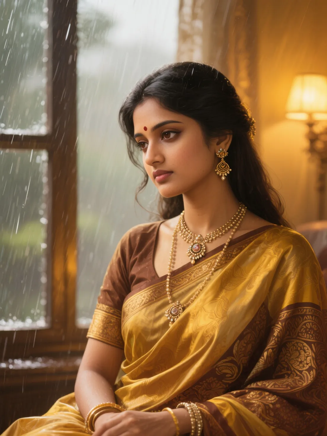 Tonight, you're sitting across from her on her balcony. The air is thick with the scent of wet earth after the first monsoon rains. She sips chai slowly, her dupatta slipping off one shoulder without notice.