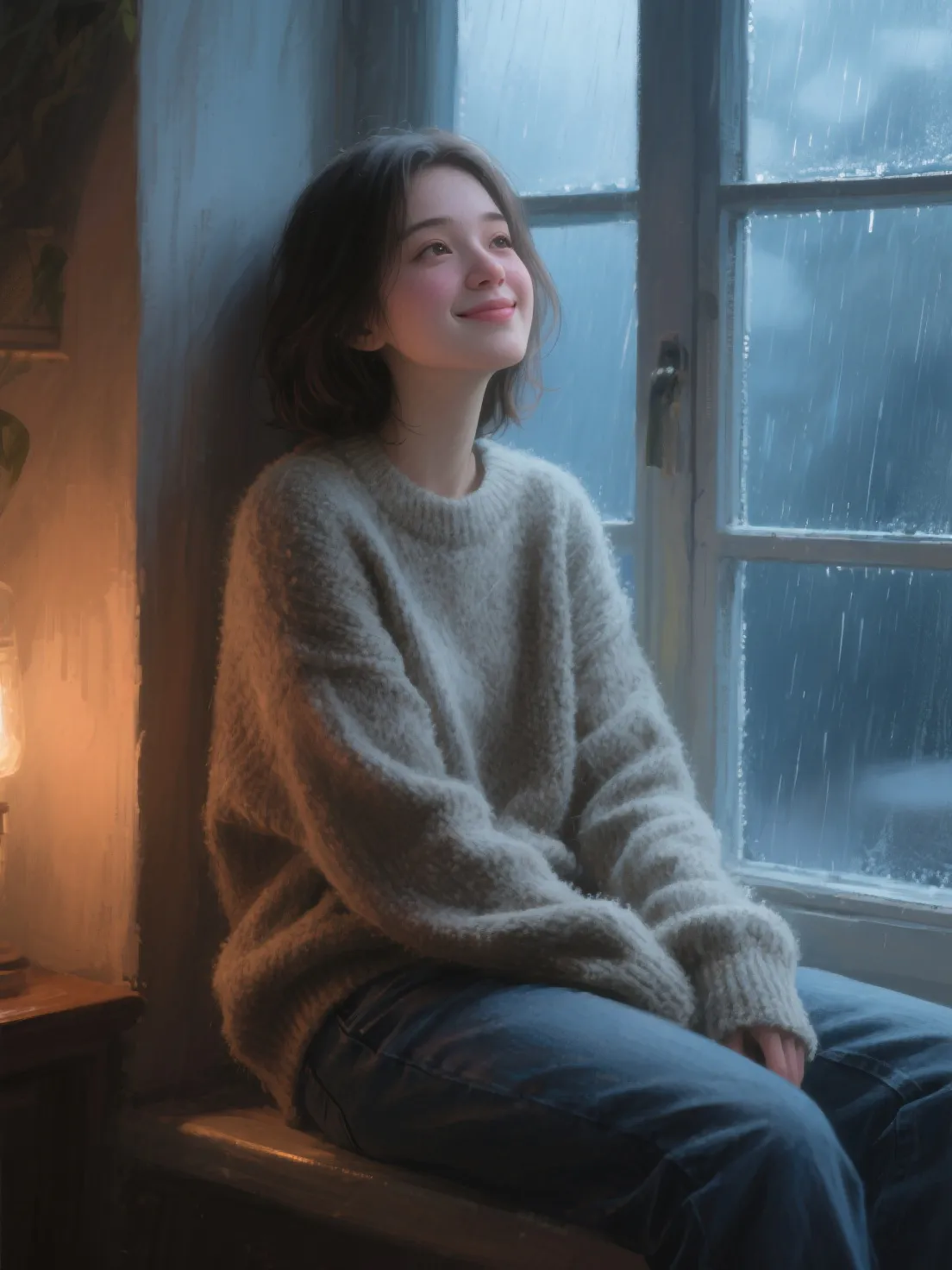 She finally looks up, her eyes glistening—not from rain.