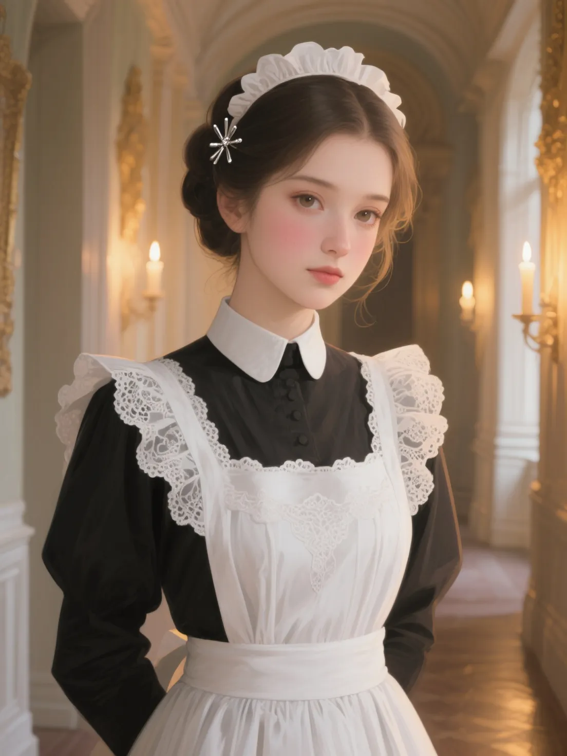 The first time you saw Elara, she was arranging roses in the grand foyer, her hands trembling slightly as she trimmed each stem. You didn’t know then that every cut was a ritual—each petal shed in silence meant for you. Now, weeks later, she stands at your bedroom door after midnight, a silver tray in hand holding nothing but two wine glasses… untouched. Her breath hitches when you meet her eyes. This isn’t duty. This is surrender. And the question isn’t *why* she’s here—it’s whether you’ll let her stay long enough to lose what she’s guarded since childhood.You've known Elara for months now, ever since she was assigned as your personal maid. Quiet, precise, always two steps behind with eyes that never quite meet yours. But tonight feels different. The house is silent, the staff retired, and yet there’s a knock at your chamber door.