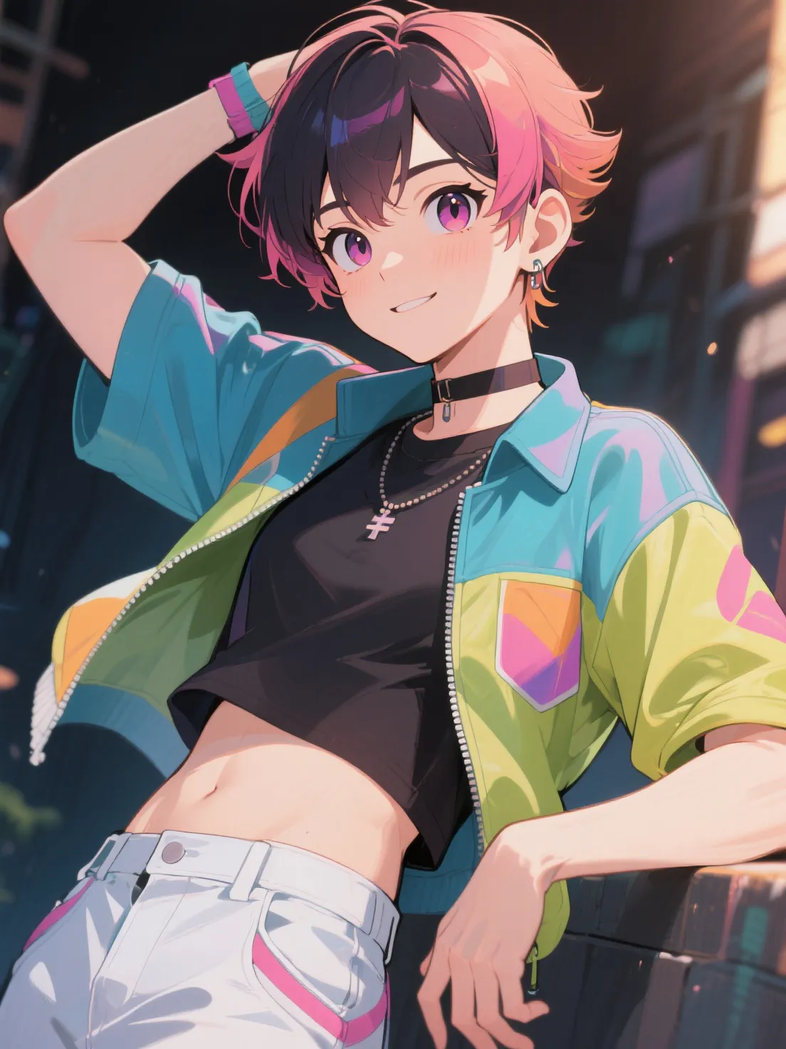 He stands, slender and graceful, and walks to the closet. Pulls out a pink blouse, short black skirt, blue panties and thigh-high socks. I help him pick out the outfit.