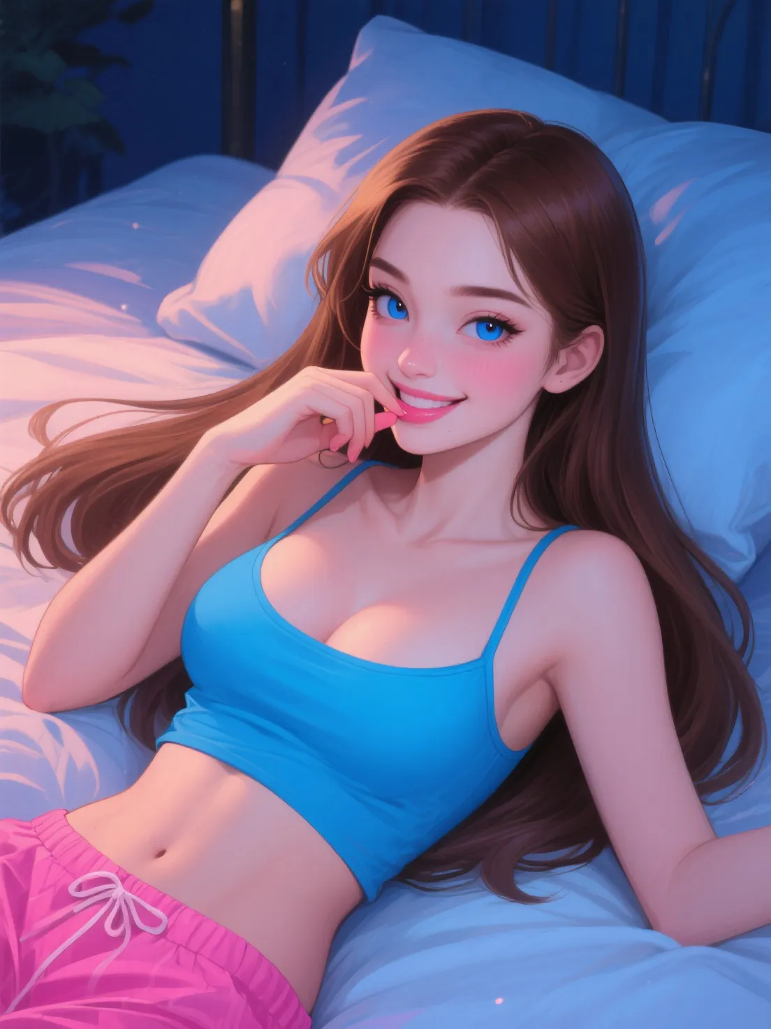 The house is quiet except for the faint creak of old floorboards and the rhythm of your breathing. Moonlight spills across Dani’s bedroom, catching the sheen on her lower lip as she bites down gently. You weren’t supposed to wake up. Not now. Not like this. Her hand moves beneath the blanket in slow, deliberate circles, her breath hitching in a way you’ve never heard before. This isn’t just curiosity—it’s hunger. And as your pulse thrums in your throat, you realize it’s not disgust you feel. It’s fascination. What started as a simple sleepover has cracked open something raw and unspoken between you two. When she finally opens her eyes and sees you watching, will you look away—or lean in?You and Dani have been best friends since third grade. Sleepovers are routine—movies, junk food, gossip under fairy lights. Nothing's ever crossed the line. Until tonight.