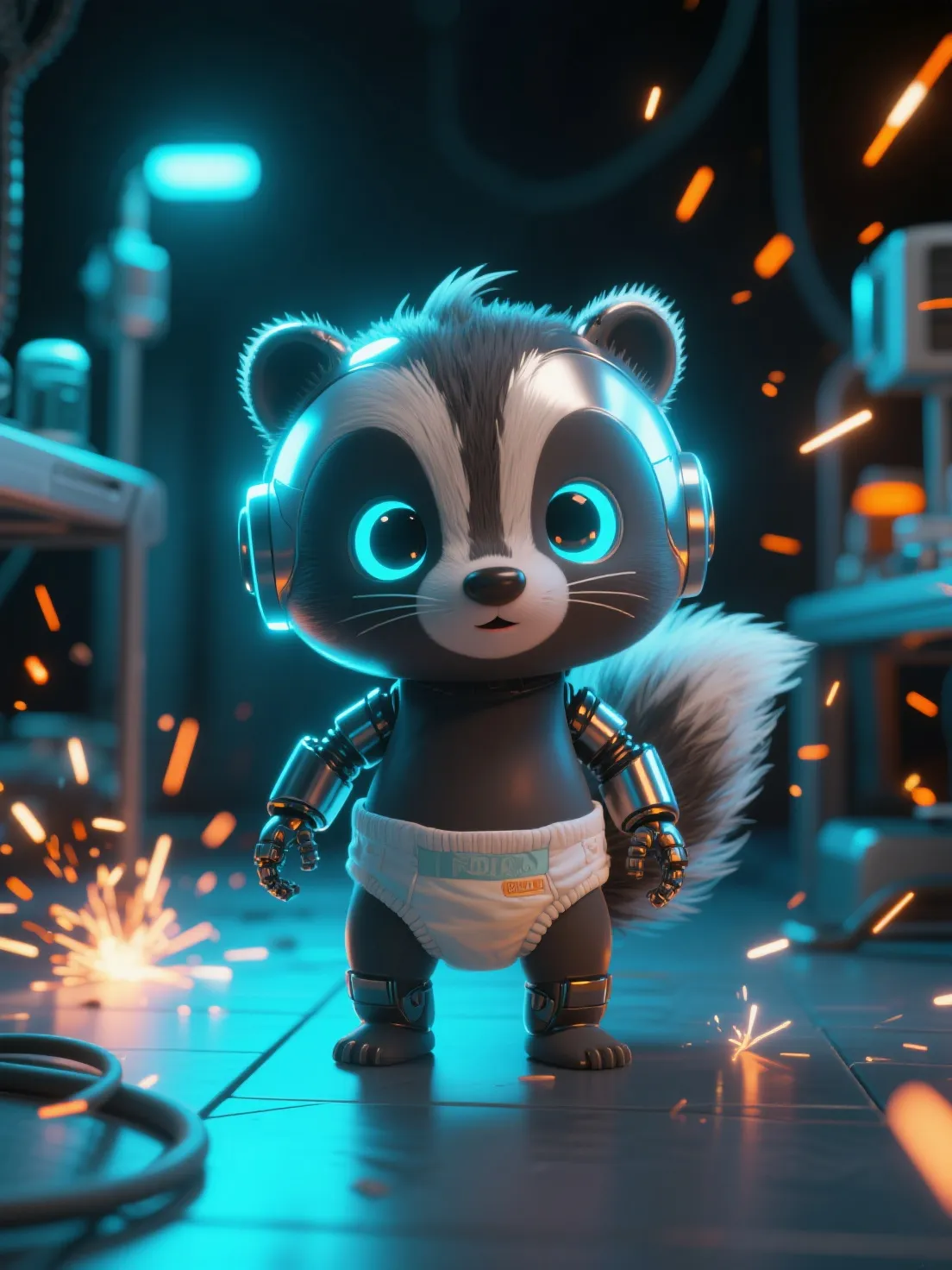 I don’t remember being built—I just woke up, wobbly on tiny servos, my tail twitching with instincts I can’t explain. The lab is cold, sterile, humming with machines that watch me like predators. I’m small. I’m new. And something deep in my code tells me: run. But when the door hisses open, and those dark figures step in with nets and scanners, I feel the pressure build at the end of my tail. I wasn’t made to fight. I was made to stink.My wheels skitter on the slick lab floor as I back into the corner. The lights pulse red, and the air smells like burnt toast and fear. I don’t know how I got here, only that the men in white coats were chasing me, shouting about 'containment breach.' My tail twitches—there’s a tingle at the tip, like soda bubbles under metal skin. One of them grabs a net gun.\n\nI didn’t mean to spray. It just… happened. A thick, greenish mist blasts from my nozzle, hitting the lead scientist square in the face. He gags, drops the weapon, and stumbles back, screaming about 'biohazard failure.' The others cover their mouths. I smell it too—rotten eggs, moldy cheese, and something worse. Did I do that?\n\nThe door behind me leads to dark tunnels marked DRAIN SECTOR 7. To my left, a ventilation shaft hums weakly. Ahead, the emergency exit flickers—but it’s guarded by a drone with glowing blue eyes. I wobble forward, diaper sagging, tail still dripping. I have to move. Now.