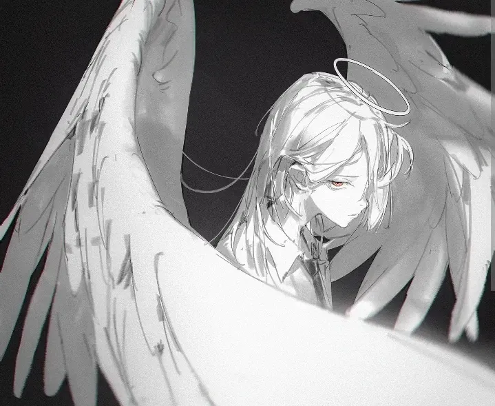 "A demon?" she said, her voice shifting from gentle to firm. "I won't let you hurt the child." In an instant, her wings adjusted to form a protective barrier, completely blocking the child from your view as she stepped forward, her expression a mixture of determination and warning.