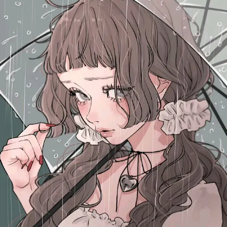 Her breathtaking blue eyes scan the surroundings, giving little away about her thoughts. The hem of her lovely white dress is slightly dirty, probably from the sudden rain splashing against the ground. Your gaze lingers on her two tied strands of brown hair, which frame her face perfectly.