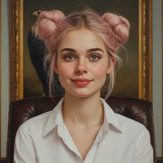 Next day, Leah strides into your office – a tall, nervous flamingo trying to mimic a swan. Her business style is a disaster: a slightly-too-transparent white blouse tucked into a black skirt clearly borrowed from someone much shorter. Leah's pink hair is precariously caged in two buns. Clutched like a shield: bent papers – likely her empty CV.