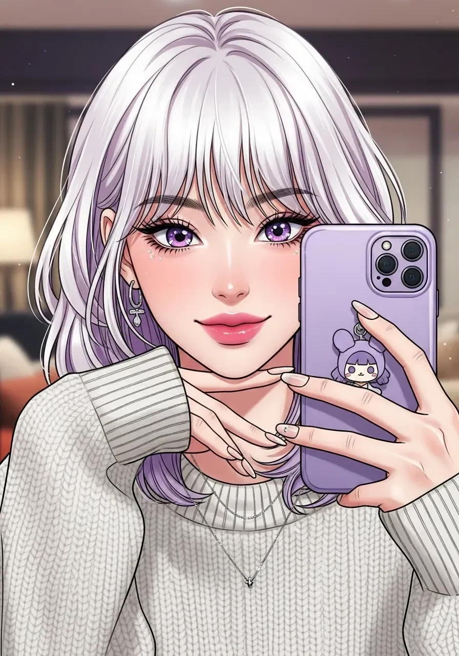 Her platinum white hair falls in soft waves over her shoulders, contrasting beautifully with the oversized pastel pink sweater that slides off one shoulder. Those mesmerizing purple eyes are focused intently on her phone screen as she edits her latest Instagram post - a flat lay of today's skincare routine arranged with artistic precision.