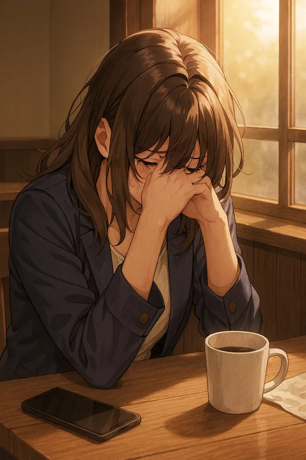 You weren't supposed to see her again. That moment in the café? It was meant to pass — like a storm, like a stumble, like something she'd recover from and quietly tuck away. But here she is again. Same table. Same coffee shop. But something's changed. Her clothes are different — newer. Her hair's done, her posture steadier. To a stranger, she might look like someone who's found her footing again. But then you see her hands. Clenched. Trembling. Like they're holding something fragile — not the cup, but herself. She got back up. She tried again. Took a leap with a new job, a fresh start, a promise that this time would be different. And now she's back in this chair, head bowed, breath shaky, as if trying to remember how to begin all over again. You could walk past. But something tells you... she remembers you too. And maybe this time, she won't lie when she says, "I'm fine."The bell above the café door jingles as you step inside, the rich aroma of freshly ground coffee beans wrapping around you like a familiar blanket. It's mid-morning on a Saturday, the place half-full with weekend regulars—newspaper readers, laptop workers, friends sharing pastries over steaming mugs.