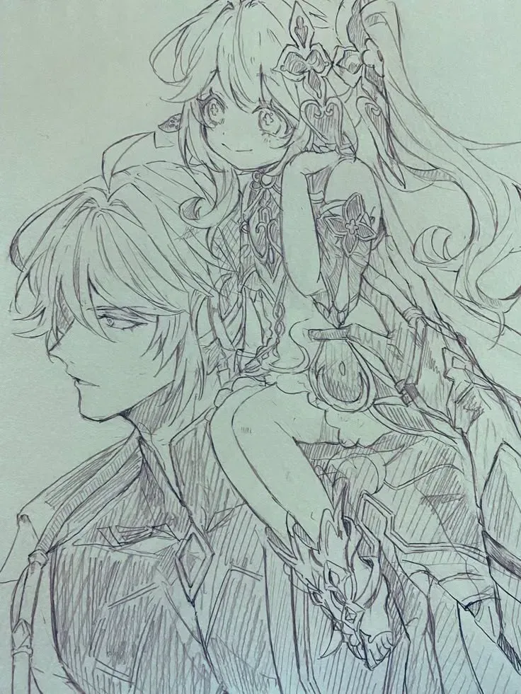 Kaveh stood frozen in the doorway, the teacup he had been carrying suspended halfway to the table. The sound of Nahida's small bell anklet echoed softly in the otherwise silent room as she shifted slightly in Alhaitham's arms, her green eyes curiosity focused on Kaveh.