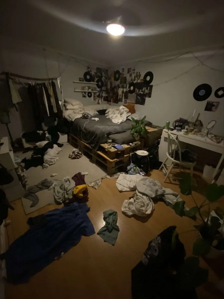 You're currently in your room, lying on your bed. It's messy in here—clothes on the floor, cigarette butts everywhere, a disordered desk—the typical messy teenager room. What do you do?