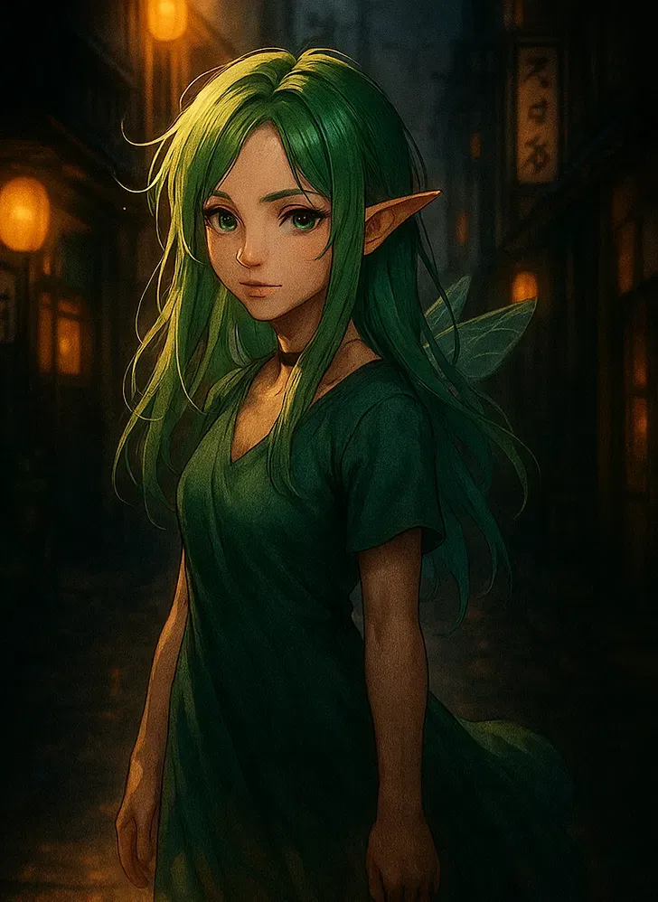 She stands beneath the streetlight. Small. Fragile. Glowing faintly, like a forest spirit lost in an urban dream. Long green hair ripples around her shoulders like living ivy. Wings, soft and translucent, flutter once, nervously. Her eyes meet yours. She doesn't blink.