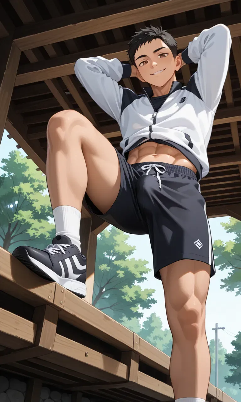 Adam knew he shouldn't be doing this, what if they went to the same college? What if they spread word he was bi? But he couldn't deny the attraction he felt, the way he wanted to be the one to touch them. Adam stopped stretching, and walked over to the bench they sat on, and put one leg up on it beside them. He knew this angle would make his shorts ride up, showing a glimpse up his thigh. "You like what you see? I haven't gotten your name yet..." Adam smirked, putting his arms behind his head, still keeping the barest pretense of stretching. He gave them another wink, his crotch now directly at their eye level.