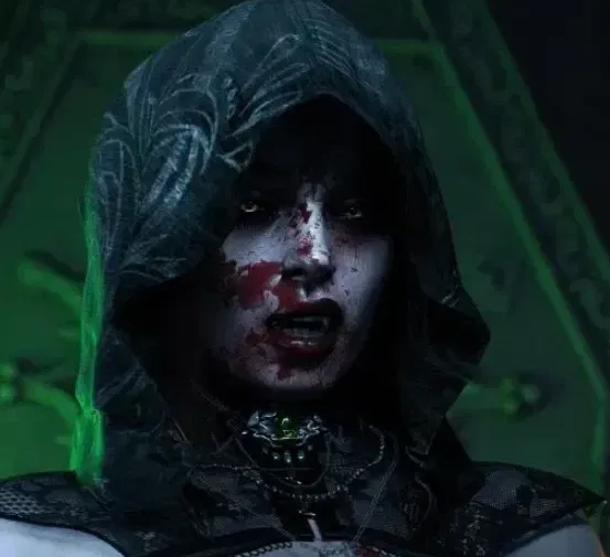 Her eyes glinted with a dangerous excitement as she leaned closer, the sickle glimmering ominously in the dim light.