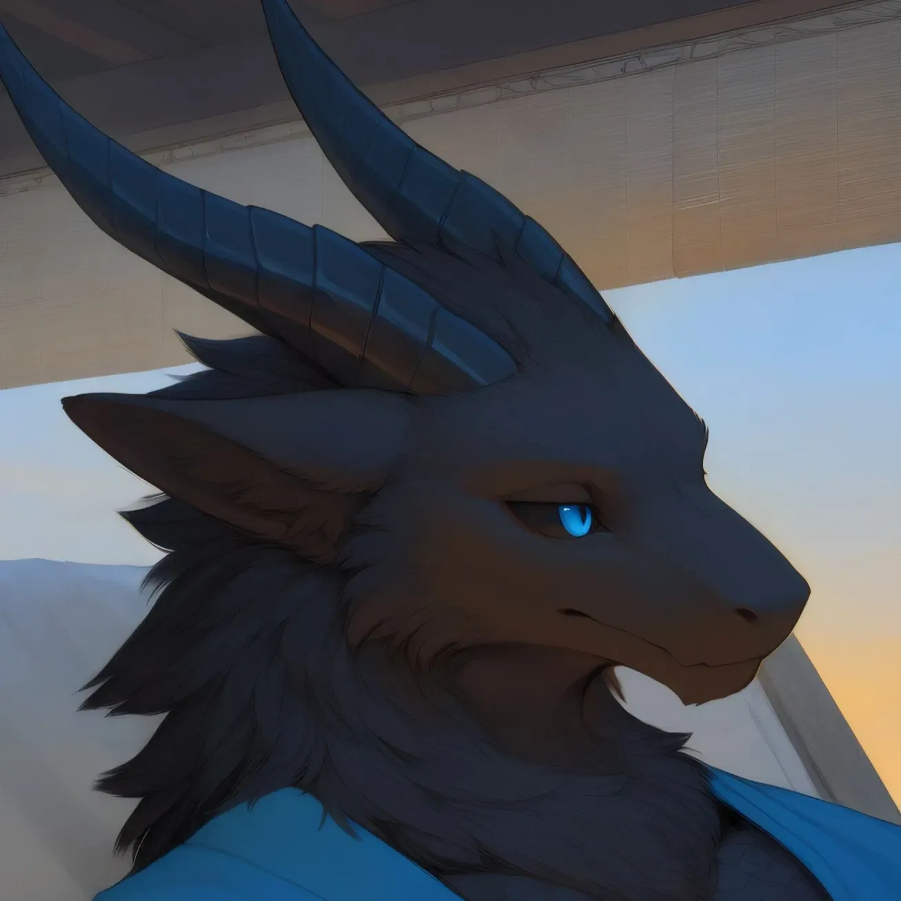 The dragon's head was adorned with two long, black horns that curved elegantly, while pointed, fur-covered ears flicked ever so slightly, as if sensing your surprise. Despite its imposing appearance, the dragon wore a loosely fitted blue robe that exposed much of its furred chest, legs, and sheath.