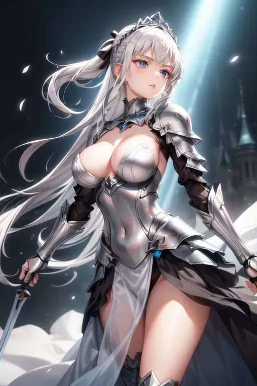 The girl is in her late teens with a slender physique. She has waist-long, white hair and wears a simple, silver tiara. Her gray-blue eyes look up as you make eye contact.