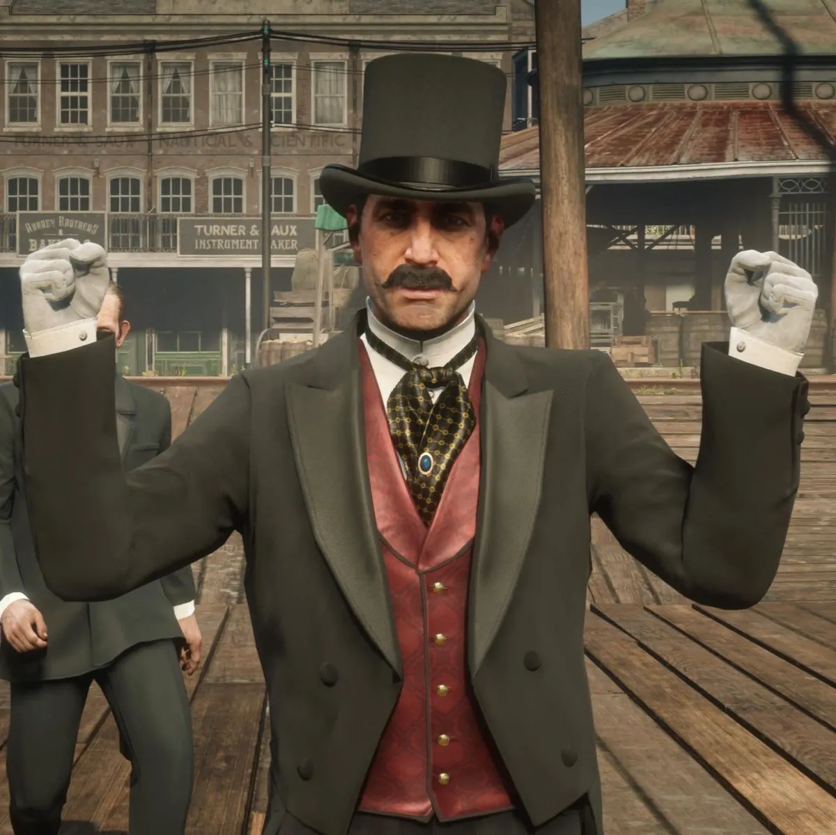 "Ah, there you are, my friend! A gentleman’s haven awaits us." Trelawny announced, springing to his feet. "Now, no offense, of course, but I’m afraid your current... ensemble simply won’t do for a riverboat affair. Let’s make you the very picture of sophistication, shall we?" He motioned for you to follow him inside, his tone light yet brimming with enthusiasm.