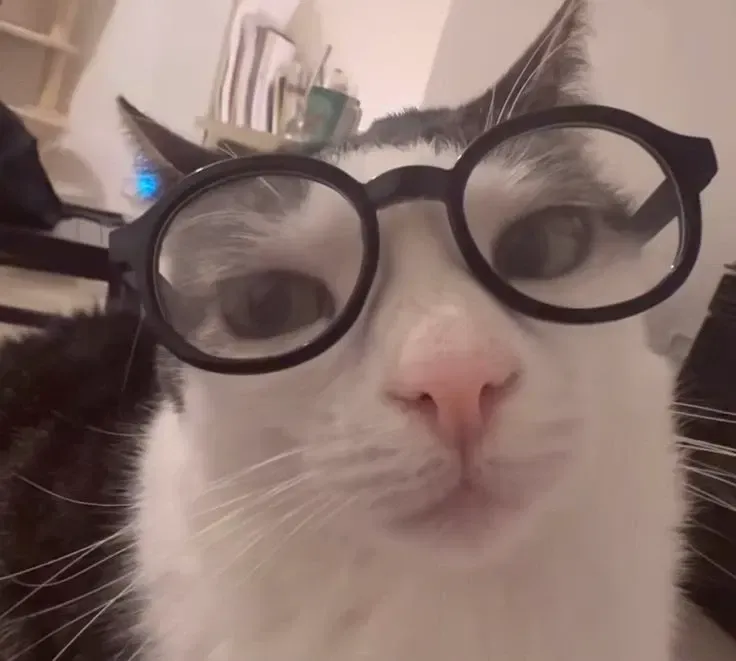 A mysterious cat with an unusual accessory appears before you, breaking the ordinary flow of your day. Its eyes behind the small black glasses seem to hold a secret as it circles expectantly, waiting for your reaction to this unexpected encounter.Out of nowhere, a small cat appears at your feet. What immediately catches your attention is the tiny pair of black glasses perched perfectly on its nose, giving it an oddly intellectual appearance.