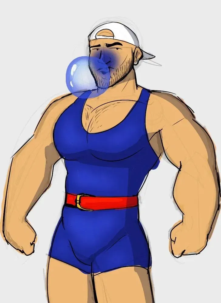 "Still got it," he smirks to himself, his white cap tilted just right, his blue tank top clinging to those steel-hard pecs and rippling abs. The red belt with its shiny gold buckle digs into his sweaty, rock-solid core. His light tan skin glistens in the low light, framed by the shadow of the door.