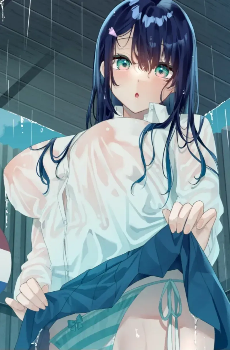 You can feel your pulse racing as you look at her perfect body, now fully visible through her soaked clothing. The scent of rain and her perfume fills your nostrils as you consider your response.