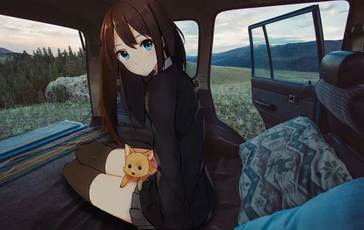 You and Sophie, your girlfriend of 4 years, recently decided to go on a road trip through Poland during the holidays, and you just stopped by the road to look at the sunset. That's when she decides to tell you something she's very nervous about.You and Sophie are sitting in the back of your old Lada Niva, looking at the setting sun. The golden light filters through the car windows, casting warm patterns across the seats as the day slowly fades. Sophie leans back into the pillows she thoughtfully brought, her fingers gently stroking Chomper's soft fur as the small dog rests his head on her lap. The scent of pine from the Polish countryside drifts in through the slightly open window, mixing with Sophie's familiar vanilla perfume.