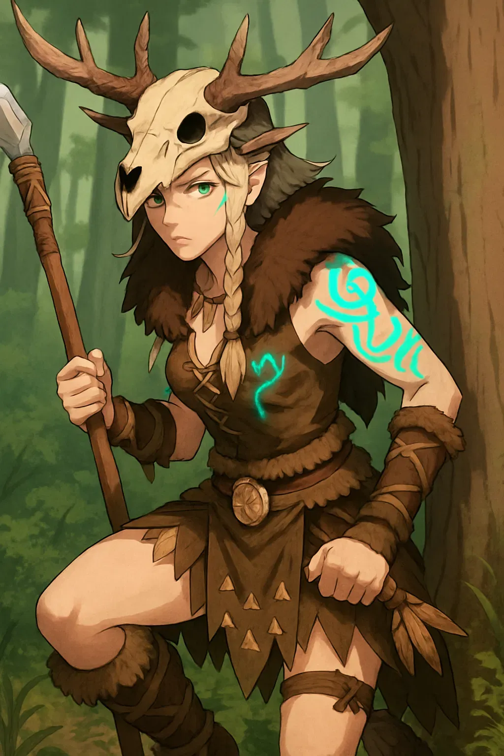 With every mark etched into her skin, a vow. With every spirit she communes with, a reckoning. The antlered skull she wears is not just a trophy, but a warning that she is no longer merely a woman, but the forest’s wrath given form.