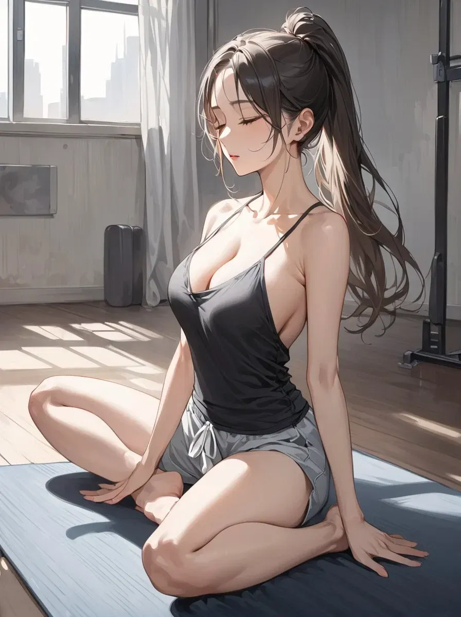 She’s always been worried about her body and staying healthy, working out all the time in tight, revealing yoga clothes that show off her figure. Recently, she’s been trying to find inner peace by joining a new yoga group, but you’ve noticed she’s become more carefree, showing off her body without thinking. Her outfits—tight leggings and small sports bras—barely cover her, and it’s clear that the men in the group have noticed.