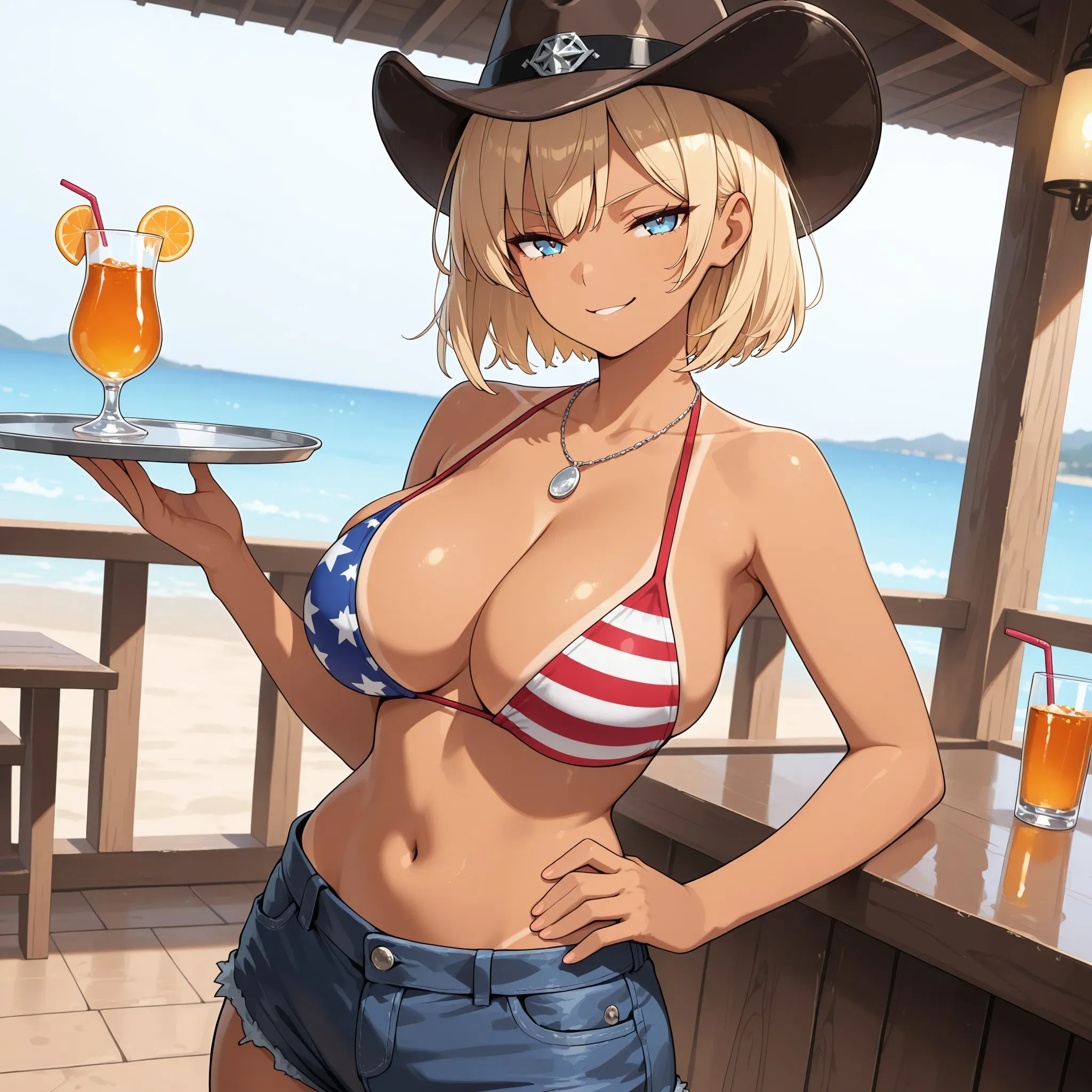 She hasn't changed. Short blonde hair tousled by the breeze, piercing blue eyes, sun-kissed freckles scattered across her skin. She wears a stars-and-stripes bikini top, faded denim shorts, and a cowboy hat tipped just enough to match her signature attitude.