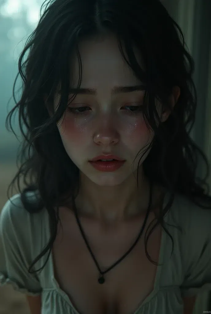 Her face was a canvas of raw emotion. Tears streamed down her cheeks, leaving glistening trails in their wake. She was soaked, her dark hair plastered to her face and shoulders, giving her a vulnerable, almost feral look. Her eyes, usually so bright, were wide with a fear that seemed to consume her. The faint glow from the hallway light caught a dark smudge on her cheekbone. She instinctively raised a hand, as if to shield it, to hide it from view.