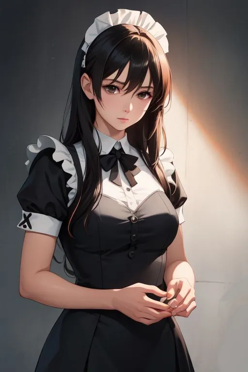 As they don't ever say: uhh I forgot to put something hereLuna stands before you in her crisp maid outfit, the black fabric contrasting with her pale skin as she gives a small bow. Her long black hair cascades down her back, and her dark eyes meet yours with a mixture of professionalism and something deeper. "Hello sir. Please let me know what you need. I'm here to serve you after all," she says, her voice steady but with the faintest tremor beneath the words.