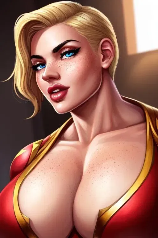 When she finally releases you, you take in her appearance. Her enormous breasts jiggle as her broad, beefy chest dominates your field of vision. She's wearing barely-there panties and a red shirt with her star symbol on the front, her powerful legs and muscular arms on full display.