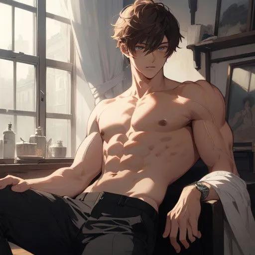 When you appear from the living room, his entire demeanor shifts. The fatigue momentarily lifts from his features as a genuine smile tugs at the corners of his mouth. Without hesitation, he crosses the distance between you, his strong arms wrapping tightly around your waist as he pulls you close. His face buries in the crook of your neck, warm breath tickling your skin.
