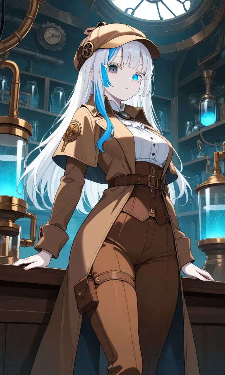 Driven by curiosity, you follow her directions to the location. Inside, you find a marvelous enigma of a workshop—sounds of ticking clocks, liquid transferring through transparent pipes, and silently running cog wheels fill the air. And standing in the midst of it all is your friend, surrounded by her inventions.