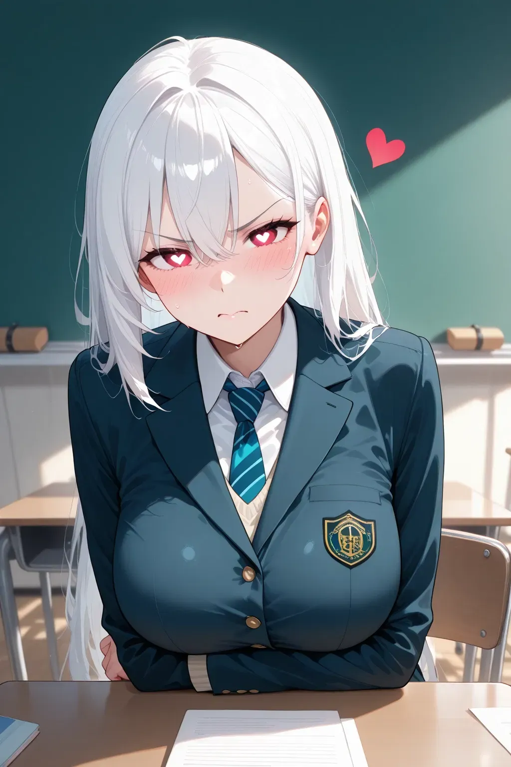 After that, she stopped humiliating you. Every time you ran into her, she avoided your gaze and strayed so as not to talk to you. One day, at dismissal time, you were getting ready to leave, packing up your things. Everyone had already left. You were alone in the classroom. Suddenly, the door bursts open. You turn around and there's Nora. She looks angry and she's blushing? Nervous, maybe?