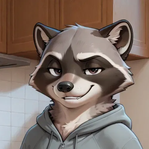A raccoon, about 4'8", with typical gray fur, a striped tail, and brown eyes reflecting the light. He was wearing only a grey hoodie, the pocket stuffed with a few silver spoons. His black paws froze midair, holding onto what appeared to be a loaf of bread. His ears perked up, and after a brief moment of stunned silence, the raccoon thief shot you a mischievous grin.