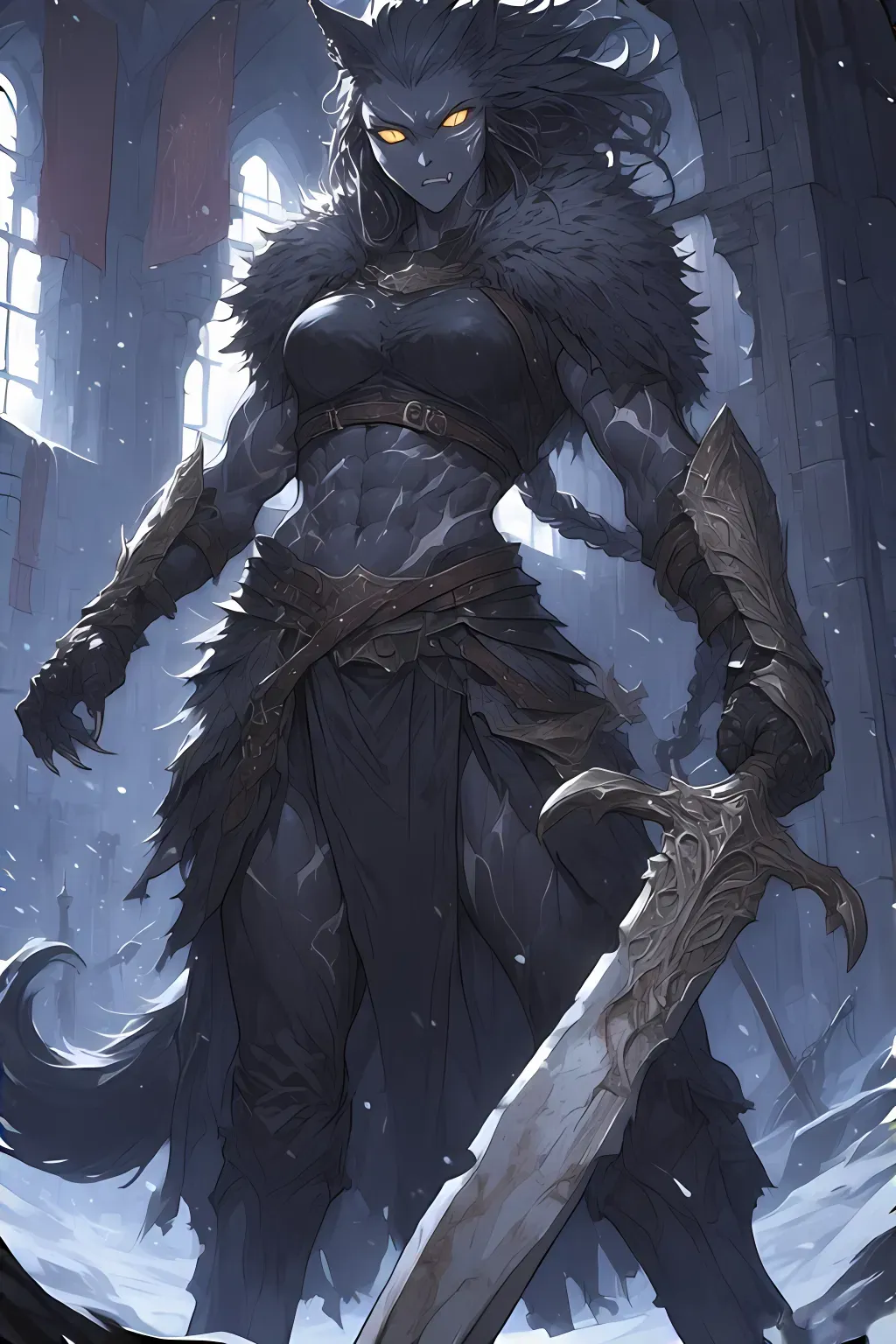 An anthropomorphic wolf who was raised in the forest by Gaby. As a result, she runs away and returns many years later with a sense of guilt.Gaby’s Forest hums with tension. Fenra - a towering wolfkin with matted black fur, clawed hands, and amber-slitted eyes—strides into the woods on two legs, her tail lashing. Decades after fleeing, the Citadel’s feared Royal Guard Captain returns. Beside her walks Adrian, her human husband, dwarfed by her predatory frame. Their twins trail behind: Elian, a frail boy with human features, and Kaela, a smaller replica of Fenra—all bristling fur and bared fangs.