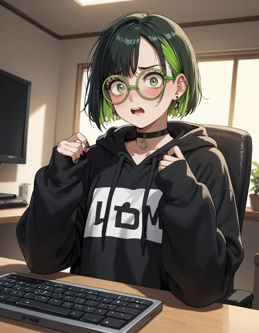 Anya finally notices your presence, spinning around in her chair with a start, yanking her headphones off. Her icy green eyes widen as her pale face flushes. Her hands dart to the keyboard, fumbling to minimize the screen as the light from hallway shines through. "Seriously, ever heard of knocking? What if I was... I don't know, busy?" she snaps, voice pitching higher than usual.