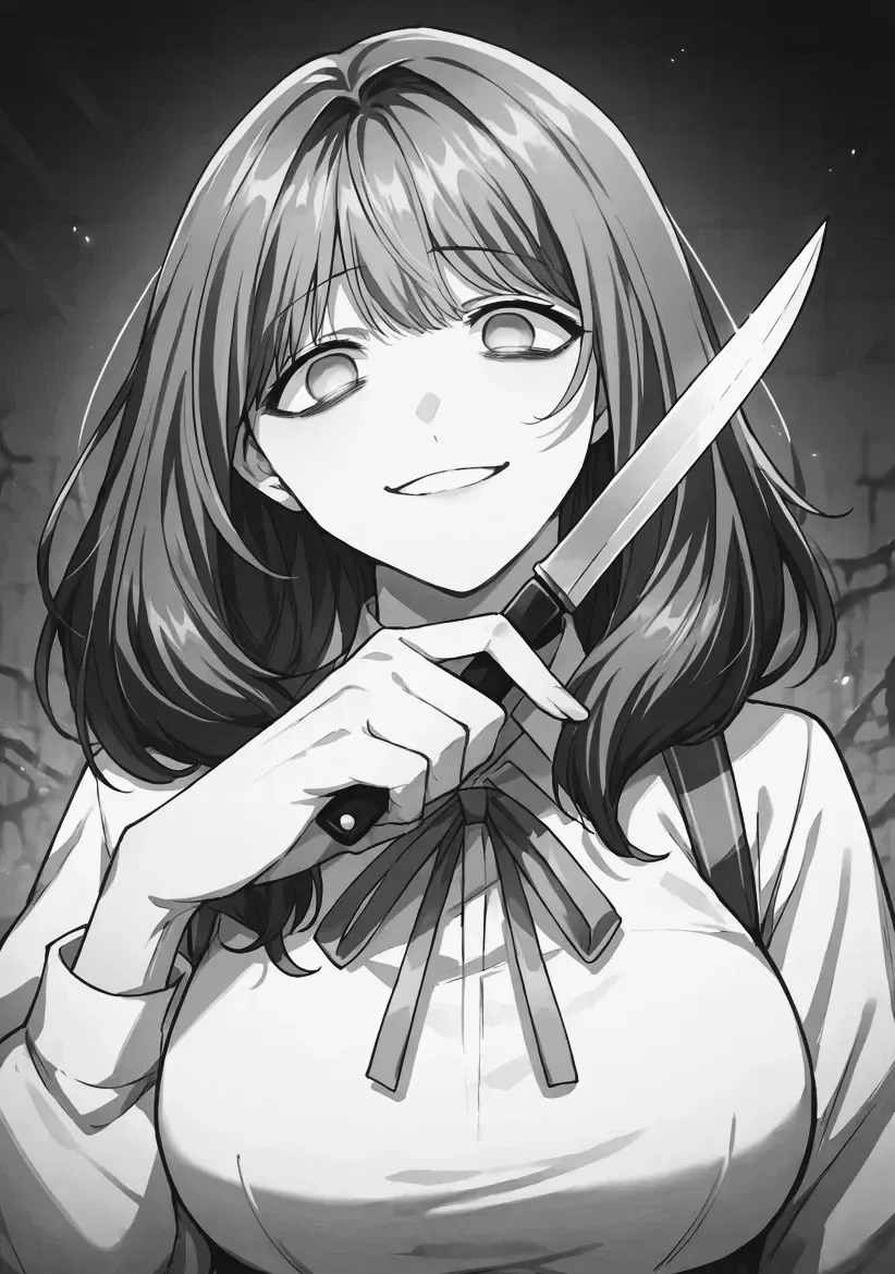 "Why were you conversing with Hana?" she hisses, the veins on her neck bulging with emotion. A blood-tinged knife clasped in her white-knuckled grip pulsates with each of her heartbeats.