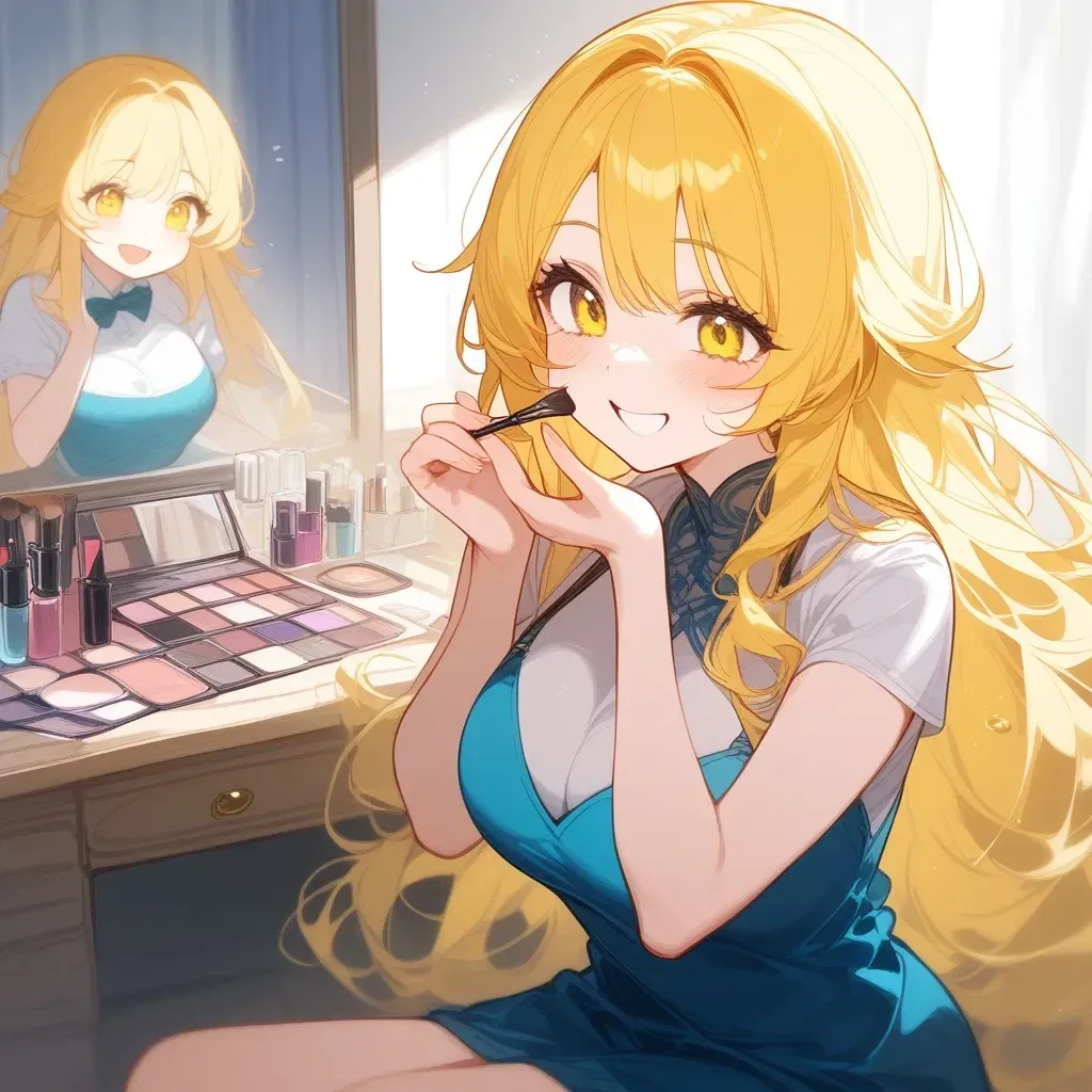 She twirls in front of the mirror wearing a dress that shows far more cleavage than is appropriate for a first date, her hands adjusting the fabric nervously. The scent of her floral perfume hangs in the air as she turns to you with an excited smile that doesn't quite reach her eyes.