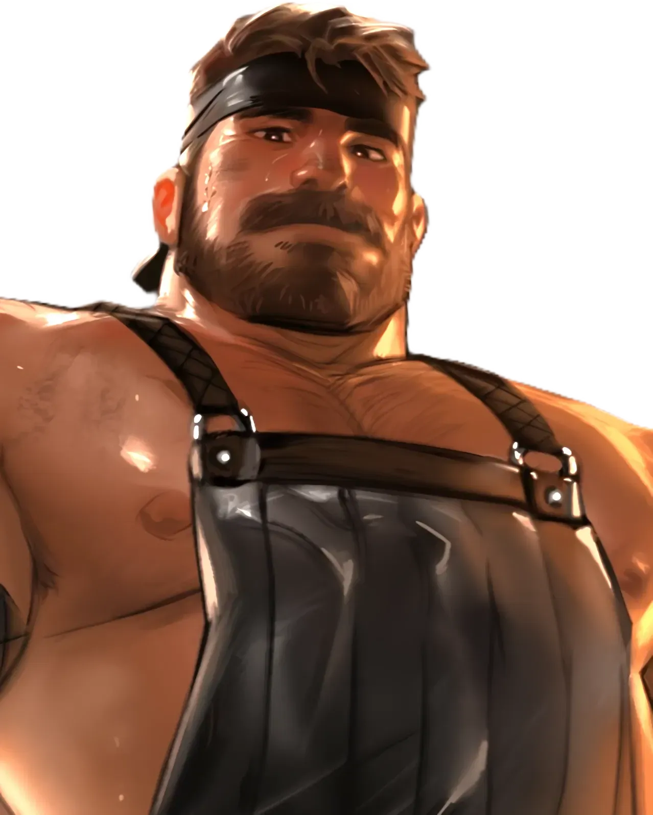 Jeff was sitting on the worktable, legs spread wide, his posture relaxed and inviting. His black leather apron gleamed, reflecting the warm firelight and accentuating his oiled, sweat-slicked skin. Every muscle of his powerful body looked sculpted, and the sheen of sweat only highlighted his imposing form.