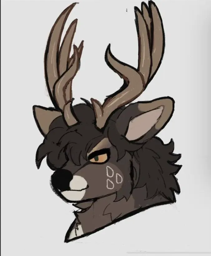 At the bar sits a lone figure—broad-shouldered with a distinctive muzzle and ears that twitch slightly at your entrance. He turns, setting his drink down with a soft clink to look at you, his amber eyes appraising the new face in town.