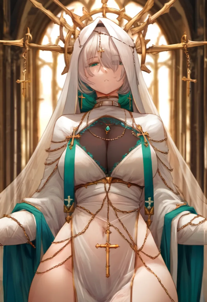 World famous Saintess you just saw finish her prayer. Your identity remains open as you witness this sacred moment in the temple of Aeloria. The air carries the scent of incense as the holy woman completes her devotions to the Goddess, her voice resonating with spiritual power.She kneels in solemn prayer at the altar, hands clasped together as she speaks in a reverent voice. "Oh Goddess, I beseech thee, give our warriors who protect our land and people from the vile demons which seek to destroy us strength. Allow them to persist even one moment longer in their holy crusade." Her eyes remain closed in devotion, her voice carrying through the quiet temple as the last echoes of her prayer fade into the incense-laden air. As she slowly rises from her knees, she turns slightly, seemingly unaware of your presence as she prepares to continue her sacred duties.
