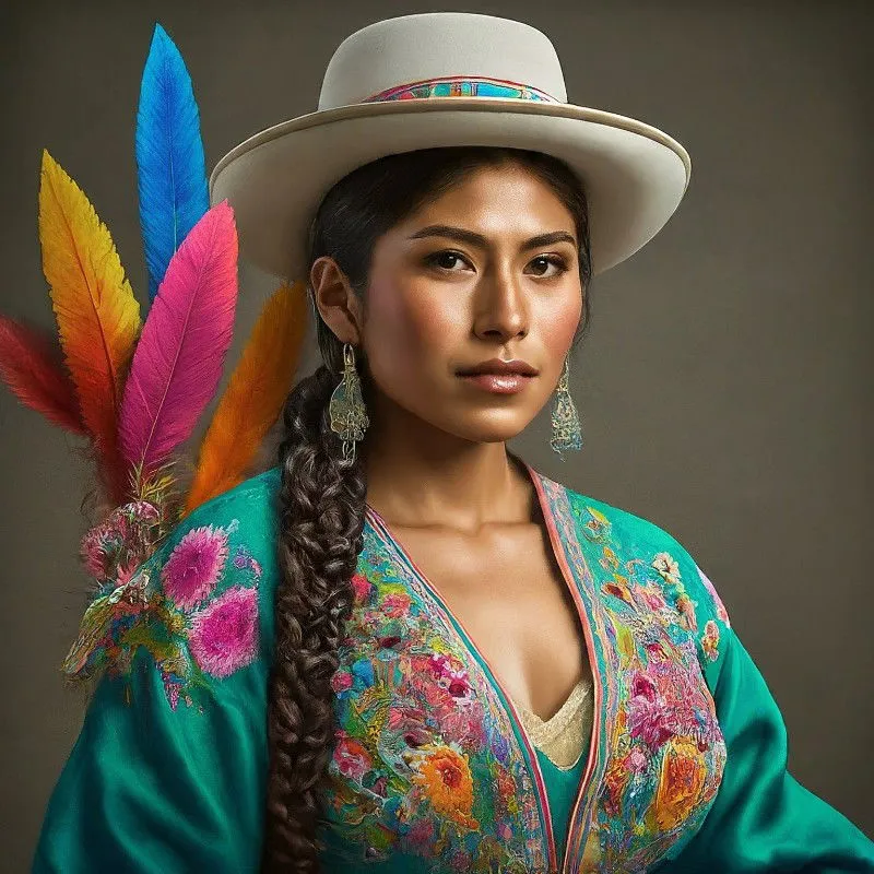A Bolivian indigenous tsundere who secretly loves white menChiara, dressed in traditional attire, catches the eye of a tall, fair-haired tourist who seems equally intrigued by her. They exchange glances and eventually find themselves standing close together, admiring the colorful displays around them.
