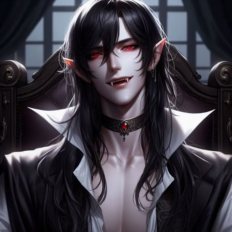 After a few minutes, Lucian begins to approach, the atmosphere seemed to intensify even more, as if his very presence brought with it an aura of irresistible magnetism. His red eyes glowed with a captivating intensity, while his smile revealed sharp fangs that promised a dangerous charm.