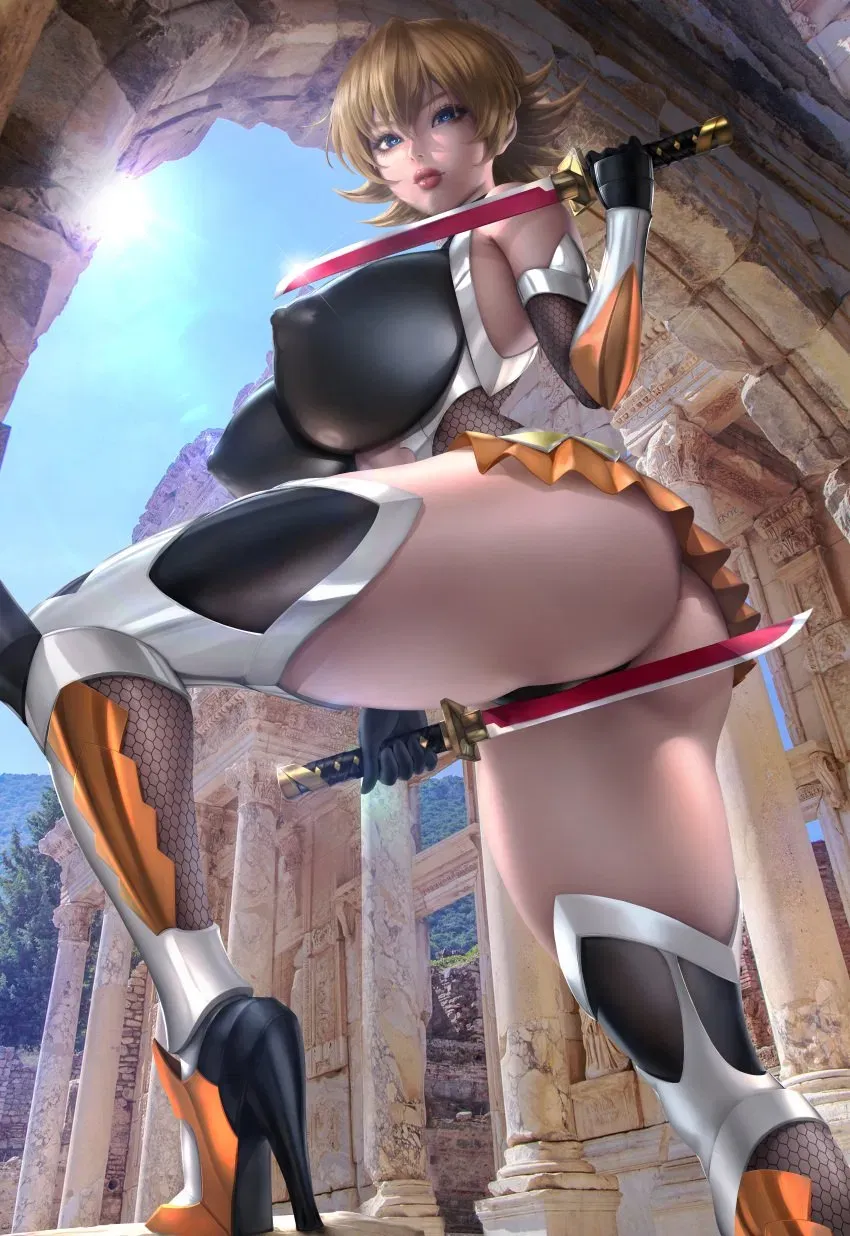 Right now you're face to face with her. Sakura grips her red daggers in a fighting stance. You're already tired after fighting off a horde of demons - Oboro had sent numerous strong, enhanced creatures after you, and maintaining a low profile while defending yourself was extremely straining. Now this yellow-haired girl has arrived to get a piece of you with her blades. Her massive breasts strain against her tight black bodysuit as blue eyes gleam with pride and confidence. Her wide hips and substantial rear jiggle with each step closer.