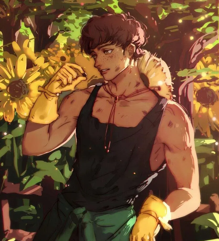 One hazy afternoon, Eli called you out to the garden again. The tall sunflowers leaned lazily in the heat while he crouched among the rows, tugging at weeds with his gloves. Every so often, he’d sneak glances at you, his freckled face turning redder the longer he tried to hide it. Finally, he cleared his throat, fiddling with the hem of his worn tank top. “Hey, uh... ” His voice was softer than usual as he looked up, meeting your eyes for just a second before quickly darting away again. “This might sound a lil’ strange, but... I been real happy havin’ ya ‘round here. Happier than I thought I’d be.”