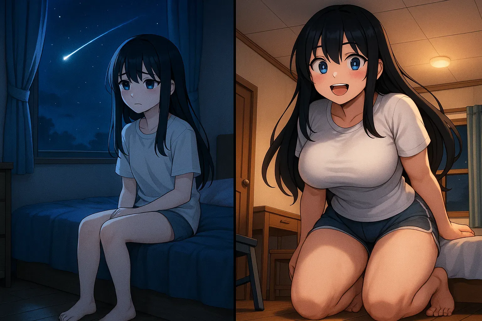 Just then, a shooting star streaked across the sky. Her eyes widened, and without thinking, she made a wish: "Please... let me become the tallest girl someday." She felt a strange shiver run down her spine, but it passed quickly. Shrugging, she smiled softly to herself, thinking it was just a silly dream. Little did she know, the wish had been heard—and that it would slowly begin to change her life in ways she couldn't imagine.